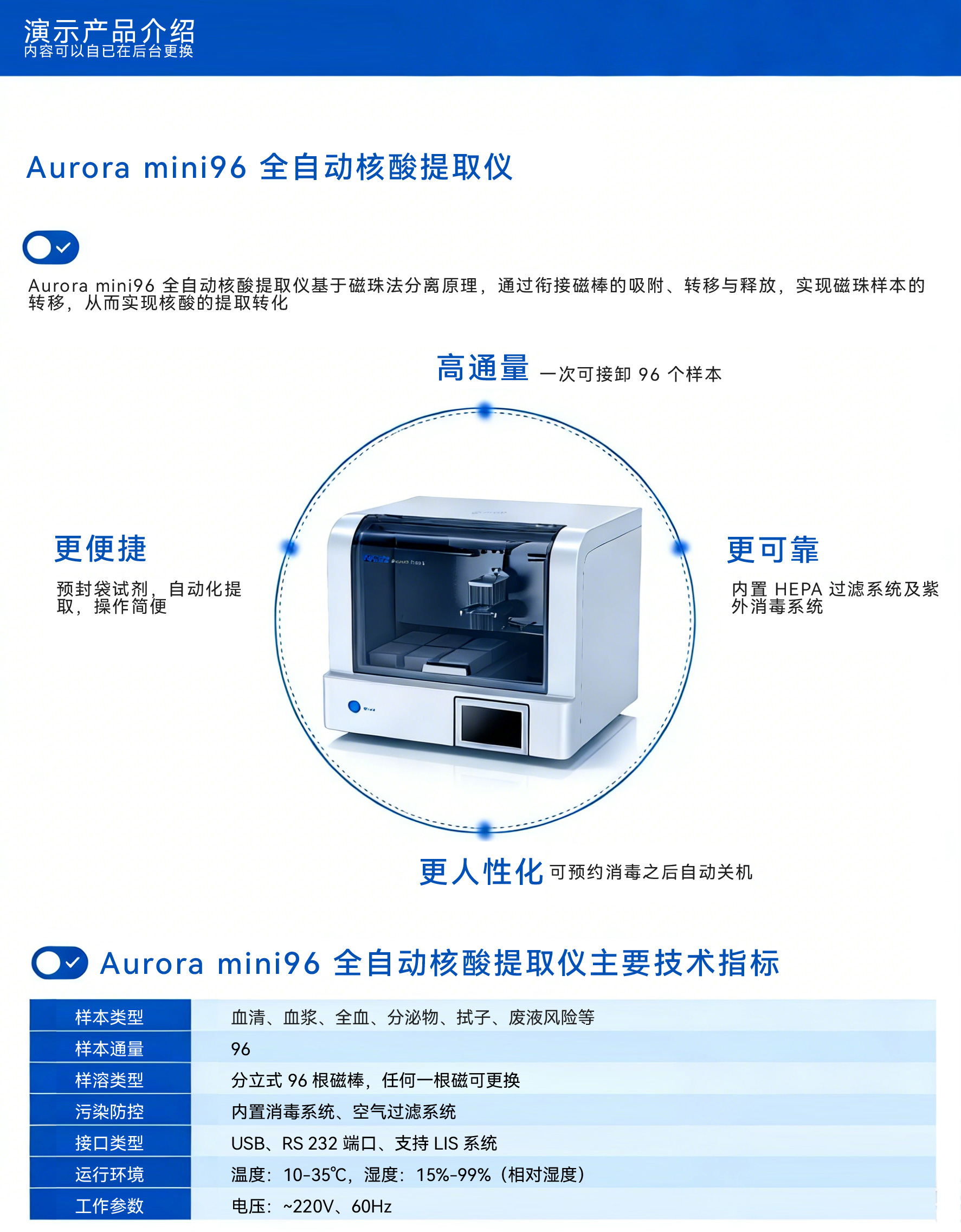 脉搏波抗干扰技术,测量准确; 双气泵充气,速度快,寿命长; 袖筒可上下左右调整角度,自动适应不同臂围(17-42cm); 彩屏,视频播放; 噪音低,工艺先进,性能稳定; 全自动血压模块,体积小方便接入